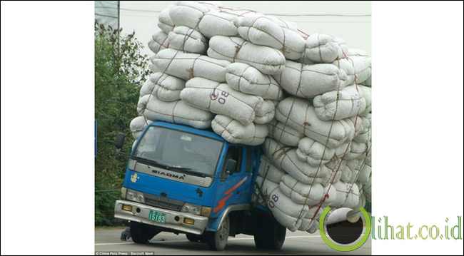 [lihat.co.id] - Truk ini tampak berjuang keras membawa beban berkarung-karung. Melintasi jalan raya Hai'an, China, truk ini menyerupai segunung bantalan yang berjalan. Pasalnya, badan truk kalah dengan besarnya muatan. Lihat saja, truk itu sudah seperti mau rebah.